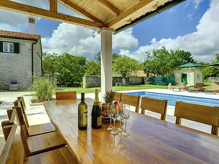 Beautiful large country estate for 14+2 people, located in Central Istria, 12 km from the beach. This lavish estate boasts 44 m2 Pool, 7 large rooms, 6 bathrooms, 2 kitchens, 1 outdoor kitchen, BBQ. It has a beautiful mediterranean garden, when you get enchanted from the flavors and scents of rosemary, lavander and fresh flowers. With over 350 m2 in indoor surface it can easily accomodate 3 large families, whereby each is accomodated in its own corner of the house. The house is traditional Istrian country estate converted into a modern cottage with SAT-TV, aircondition, dining room, table tennis etc