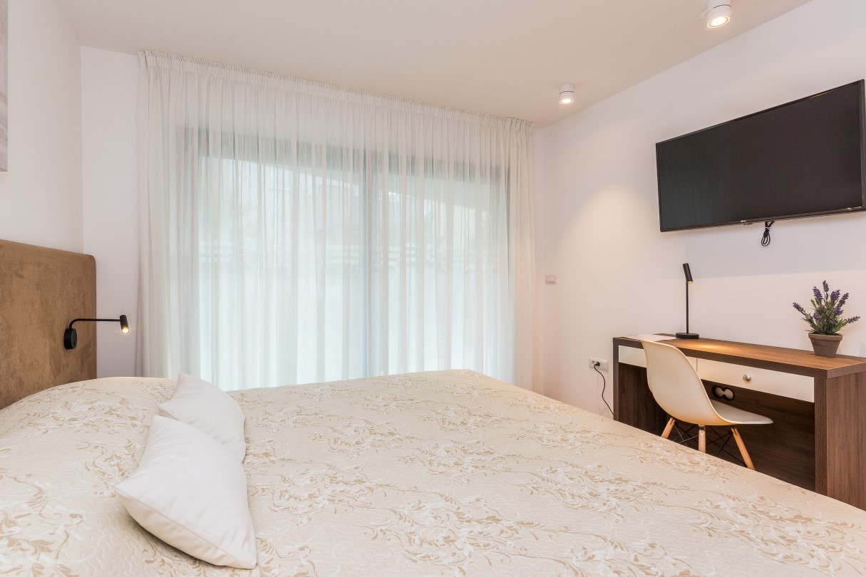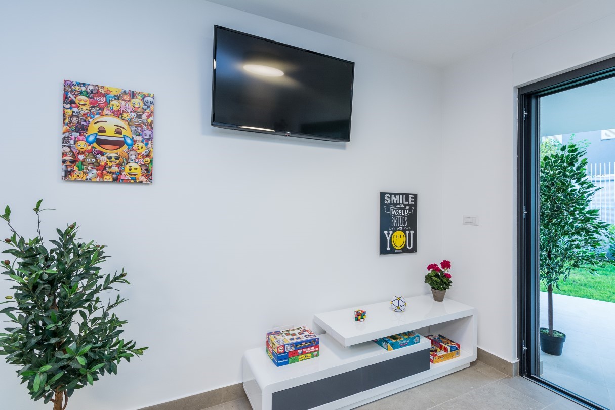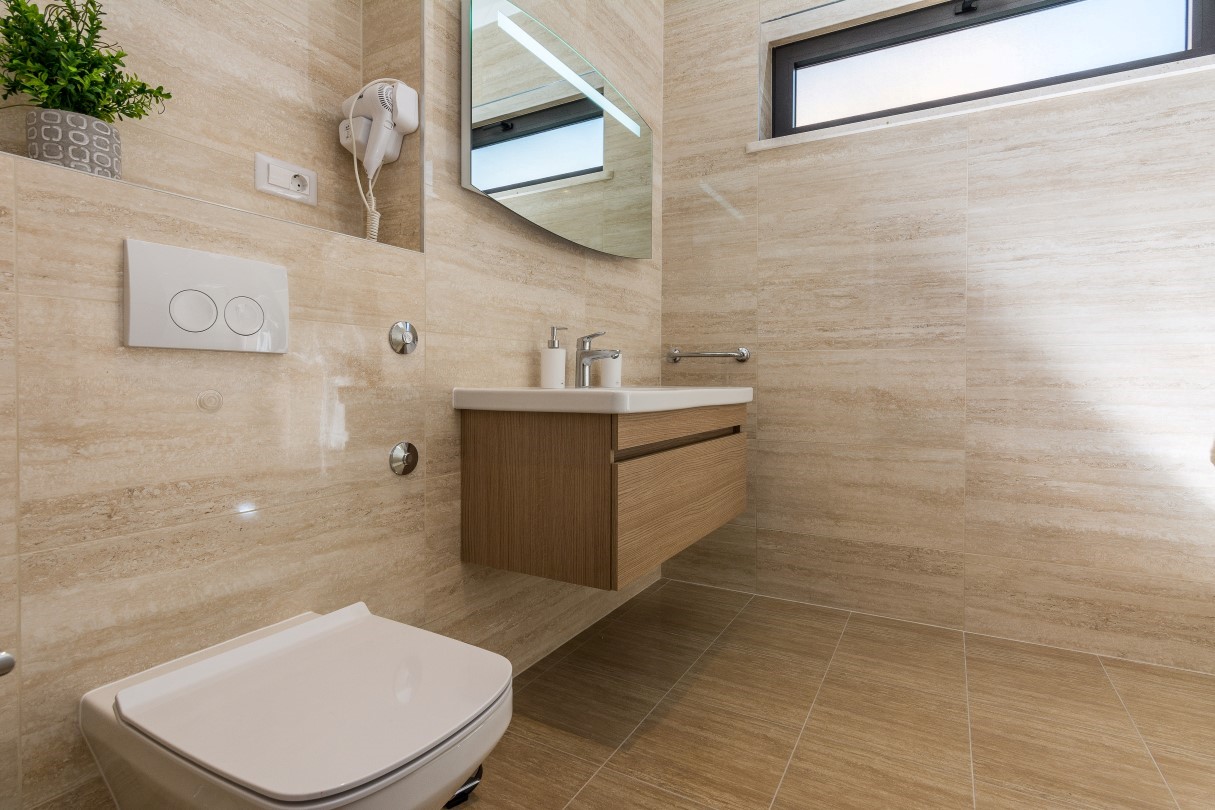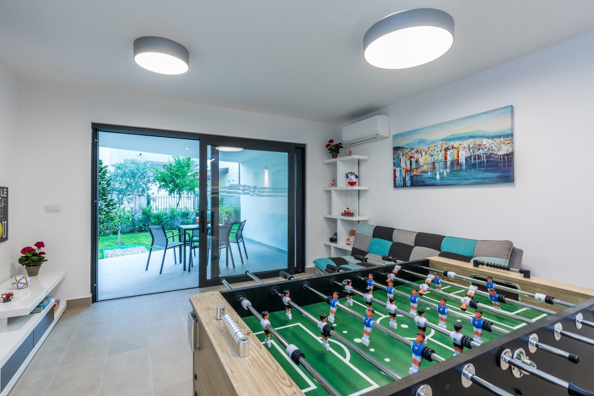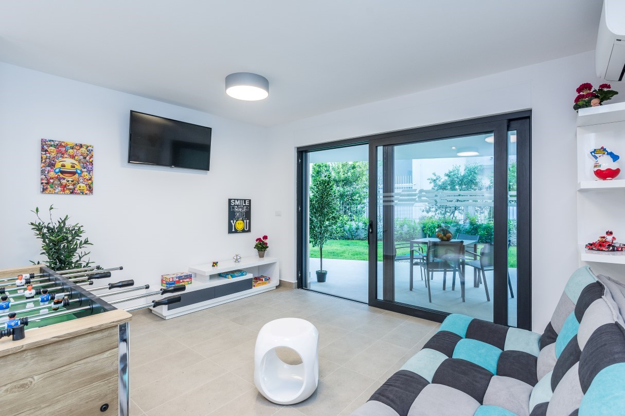 The outdoor area with a swimming pool is as beautiful as the interior. Deck chairs provide a perfect means to enjoy the sunbathing during long sunny summer days. There you can relax, swim in the private pool or just read your favourite book while the children play in fully fenced yard. Spacious terrace with dining table and grill space is ideal for evening gatherings with great food and refreshing sea breeze that brings intense scent of pine trees and lush Mediterranean vegetation.