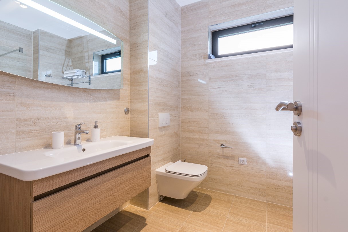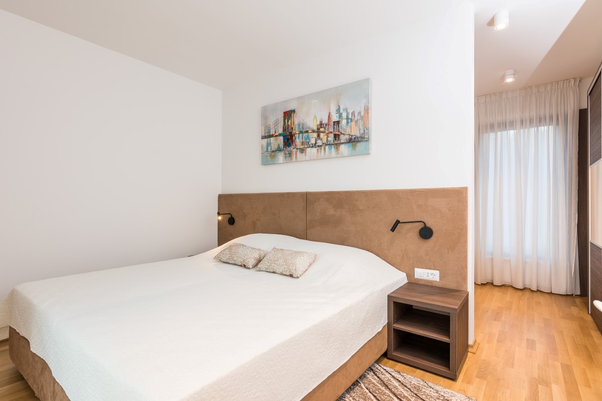The interior is open, modern and bright. Elegant furniture creates pleasant atmosphere for luxury holiday. Big windows from ceiling to the floor in the living room provide enough natural light during the day and serve as a direct connection from living room, kitchen and dining room to the beautiful terrace.