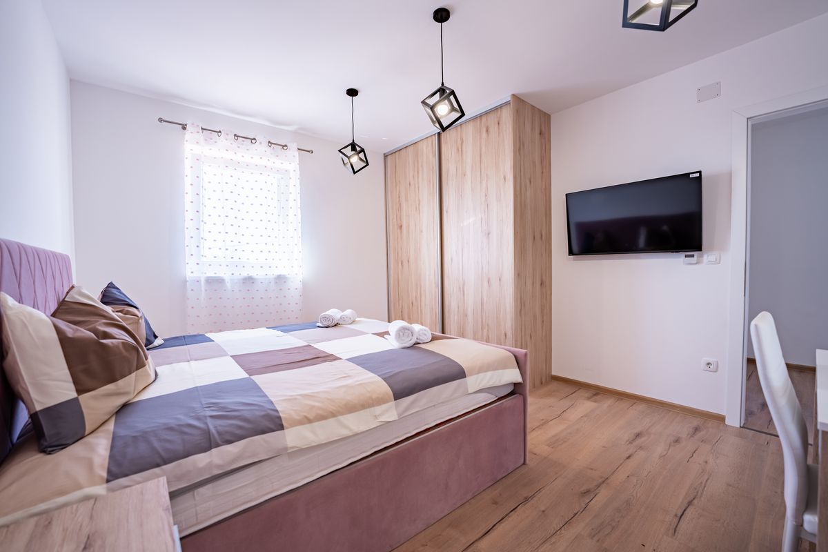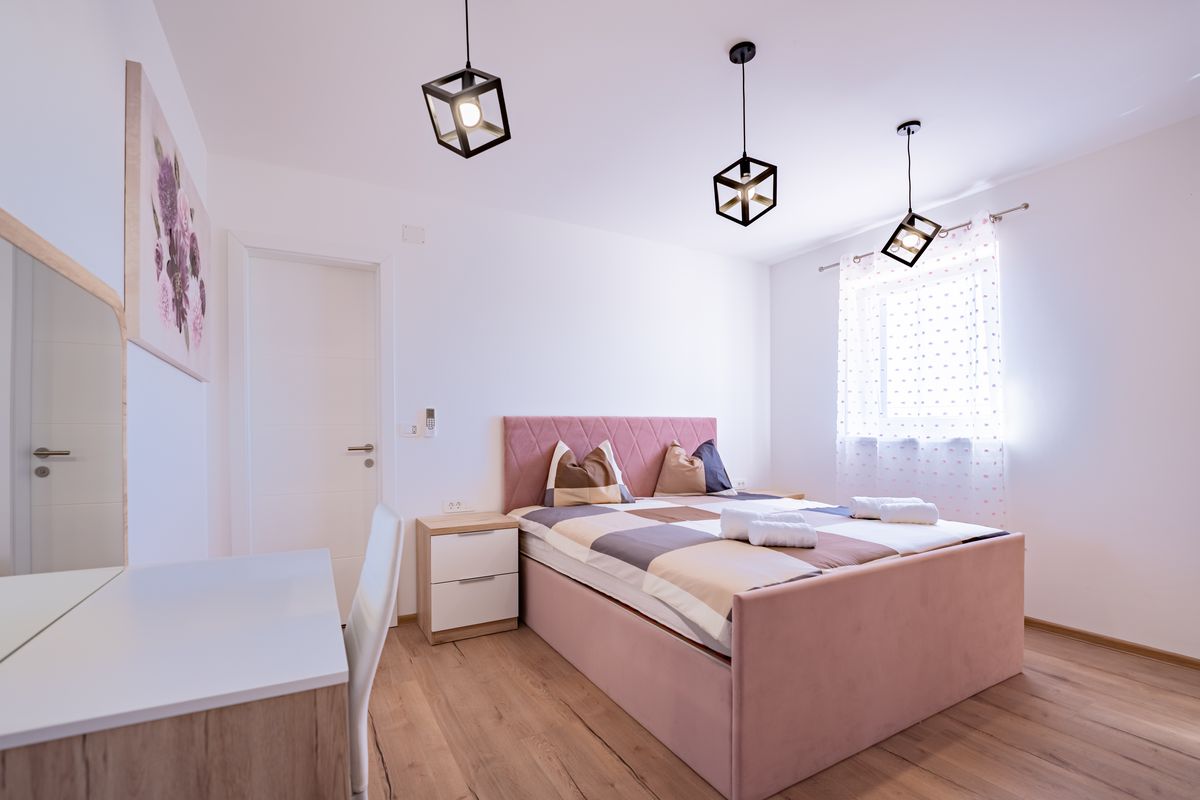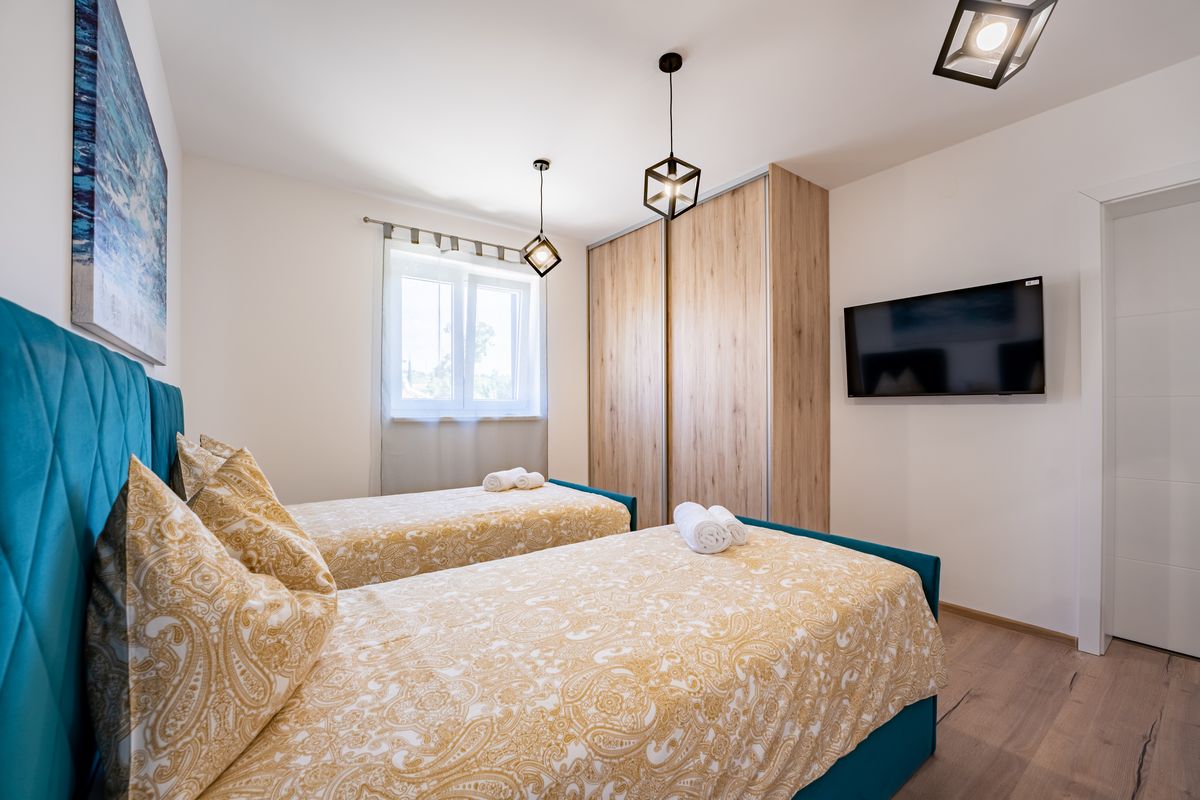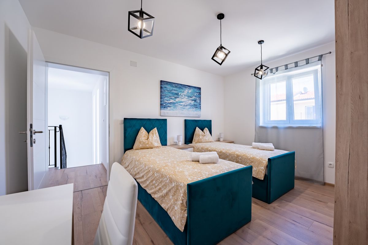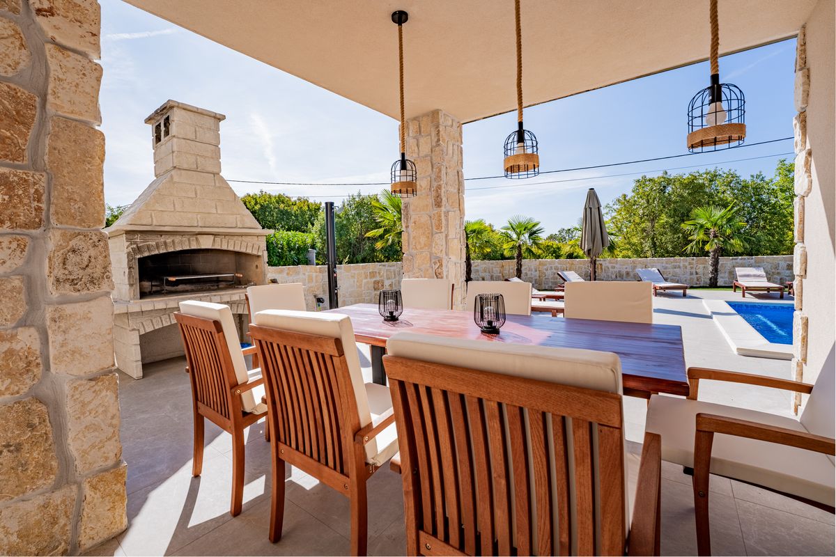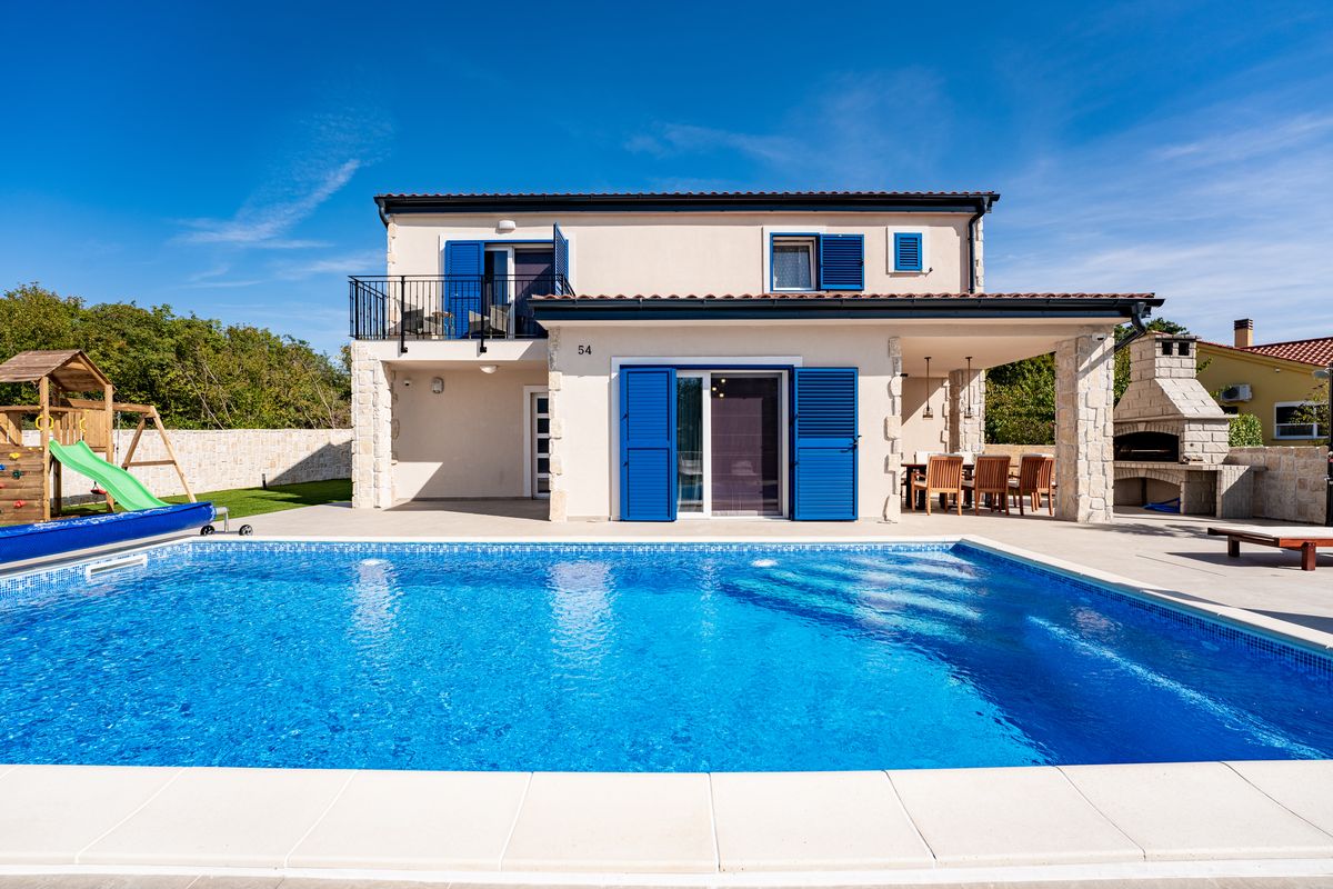 Villa Silvia Krk is modern comfortable 5-bedroom villa (200 m2) with private open swimming pool (32 m2) in small quite village. 4 Bathrooms ensuite plus 1 Toilet. Spacious living room with fireplace, dining area (for 10 persons) and fully equipped kitchen. Terrace with barbecue and outdoor sitting (10 persons). Outdoor area for children. Three parking spots on the property. Spacious garden around the house fully fenced. Outdoor furniture, Darts. Children playground.