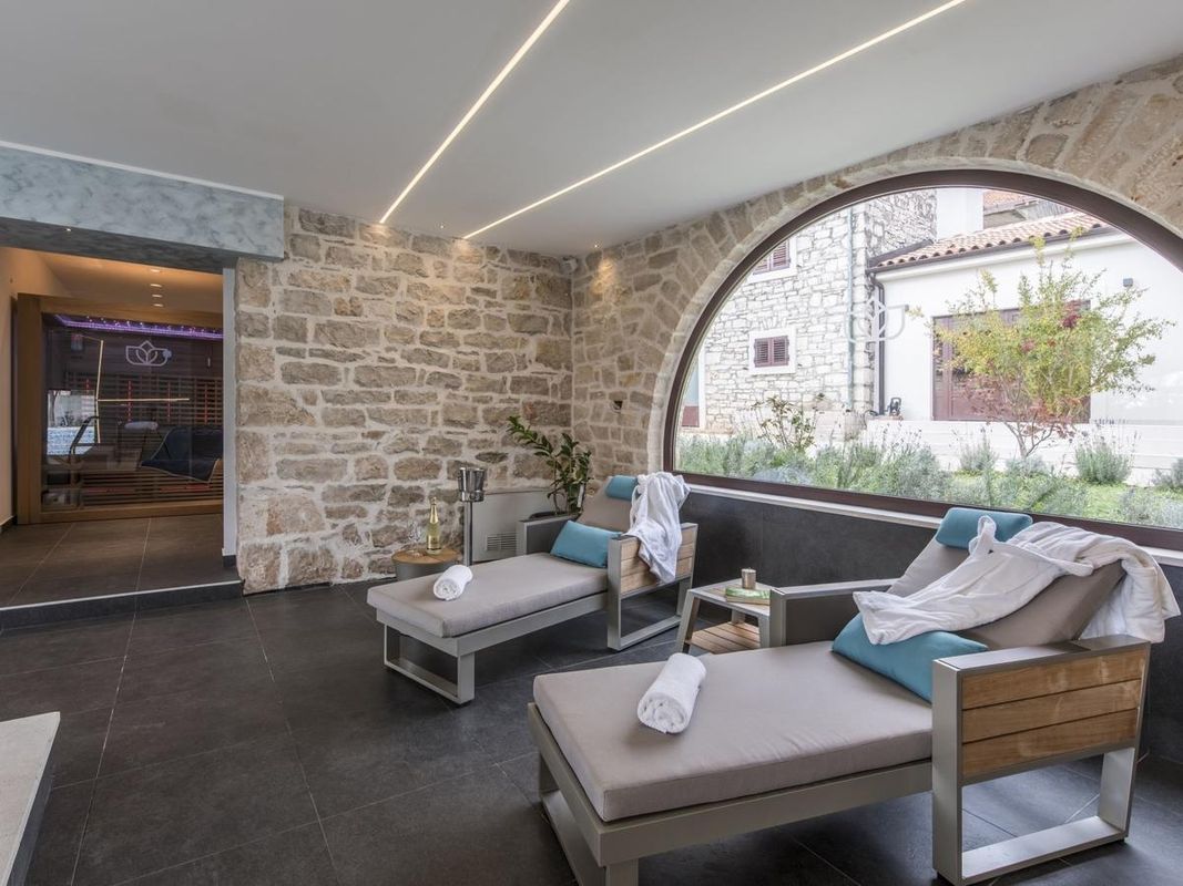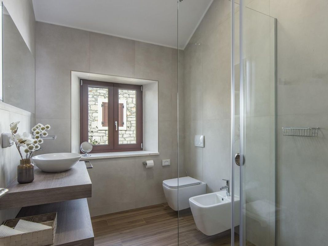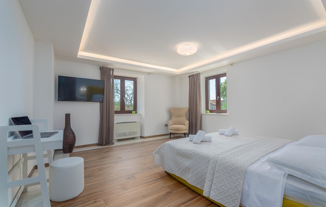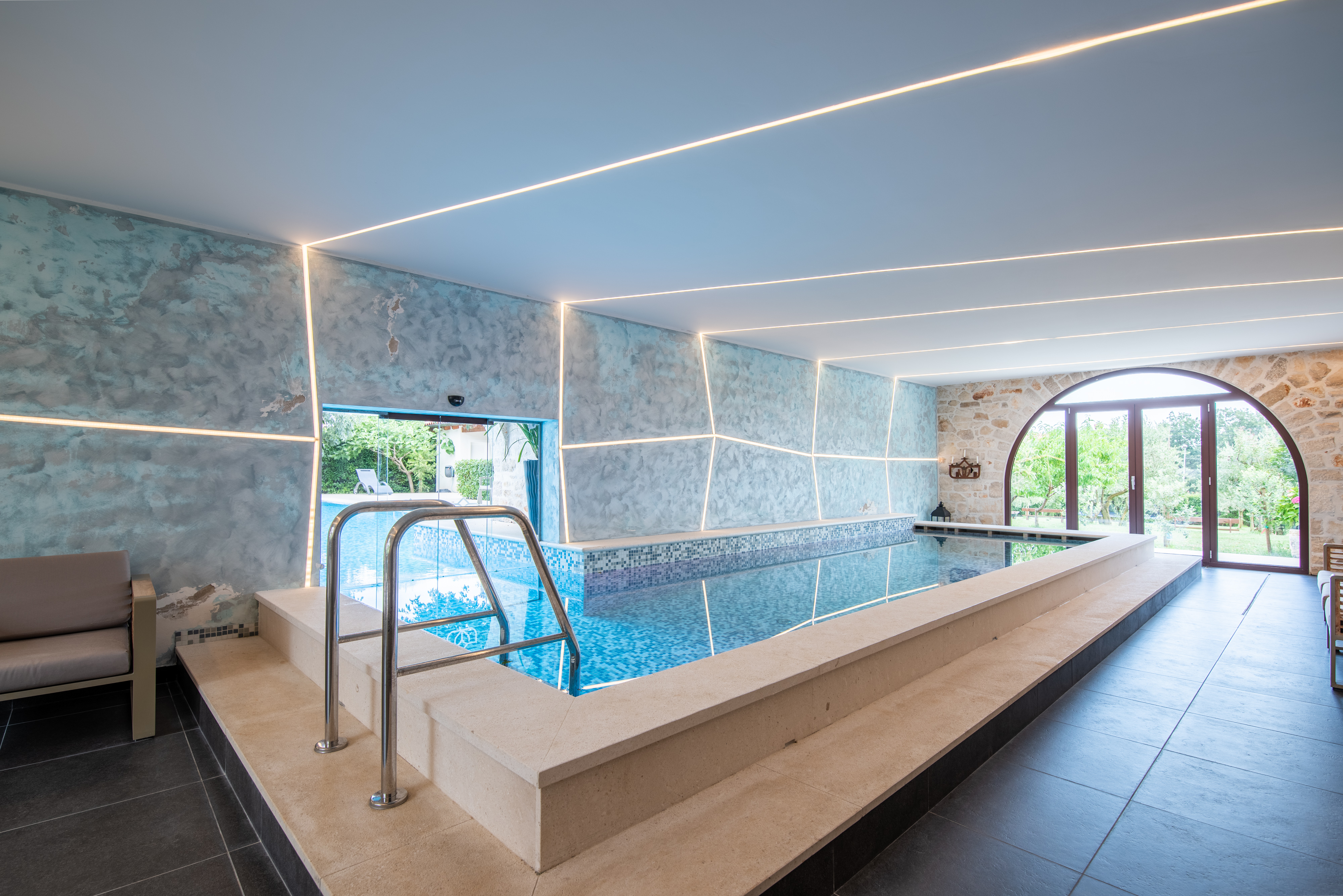 This wonderful villa is a successful conversion of an original Istrian stone house into a modern villa with pool. It boasts over 400 m2 of internal surface, has 4 large bedrooms, 5 bathrooms, both indoor and outdoor pool, sauna, jacuzzi and all the possible amenities of a top, exclusive villa. It is located in a quiet village of Fiorini, halfway between Umag and Brtonigla. It is surrounded by an large mediterranean garden with grown plants of lavander and rosemary, whose scents will hypnotise you and prepare for a wonderful holiday.